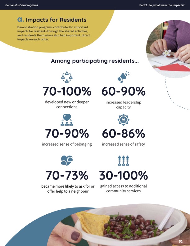 Over the past five years, Hey Neighbour Collective (HNC) demonstration partners piloted a wide range of social connectedness programs in a variety of contexts, from shared meals in social housing to emergency preparedness workshops in market condominium buildings. Yet, across all of these diverse initiatives, there was striking consistency in the impacts on the majority of participating residents.